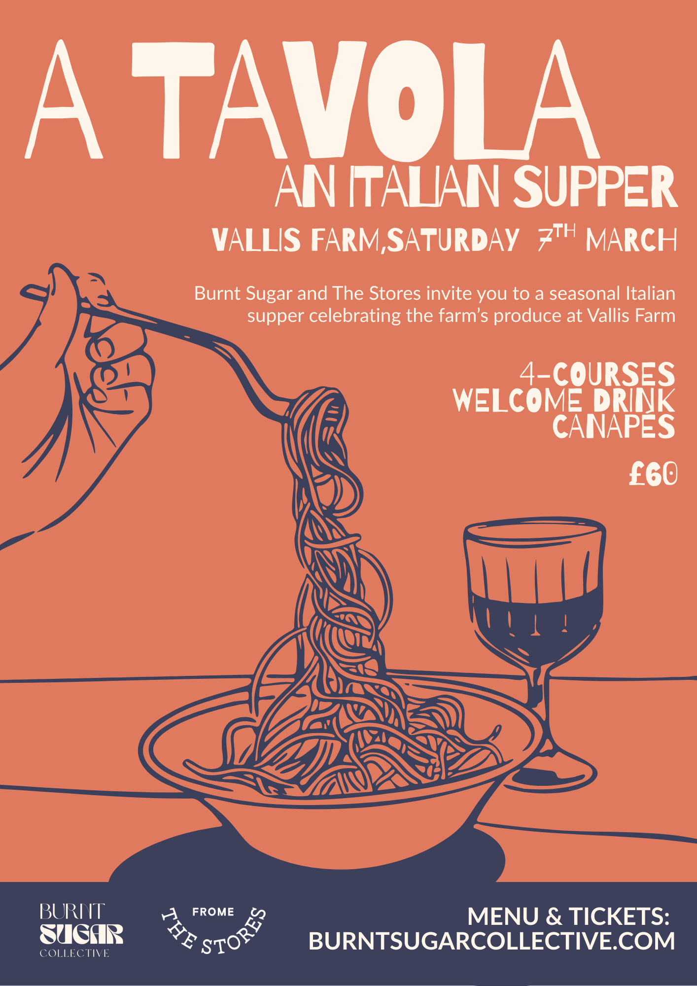 The evening centres on a set menu inspired by Italian home cooking, brought to you by Burnt Sugar Collective, using seasonal produce sourced with care. Dishes are generous and considered, served over the course of the evening and designed to be enjoyed at an unhurried pace.